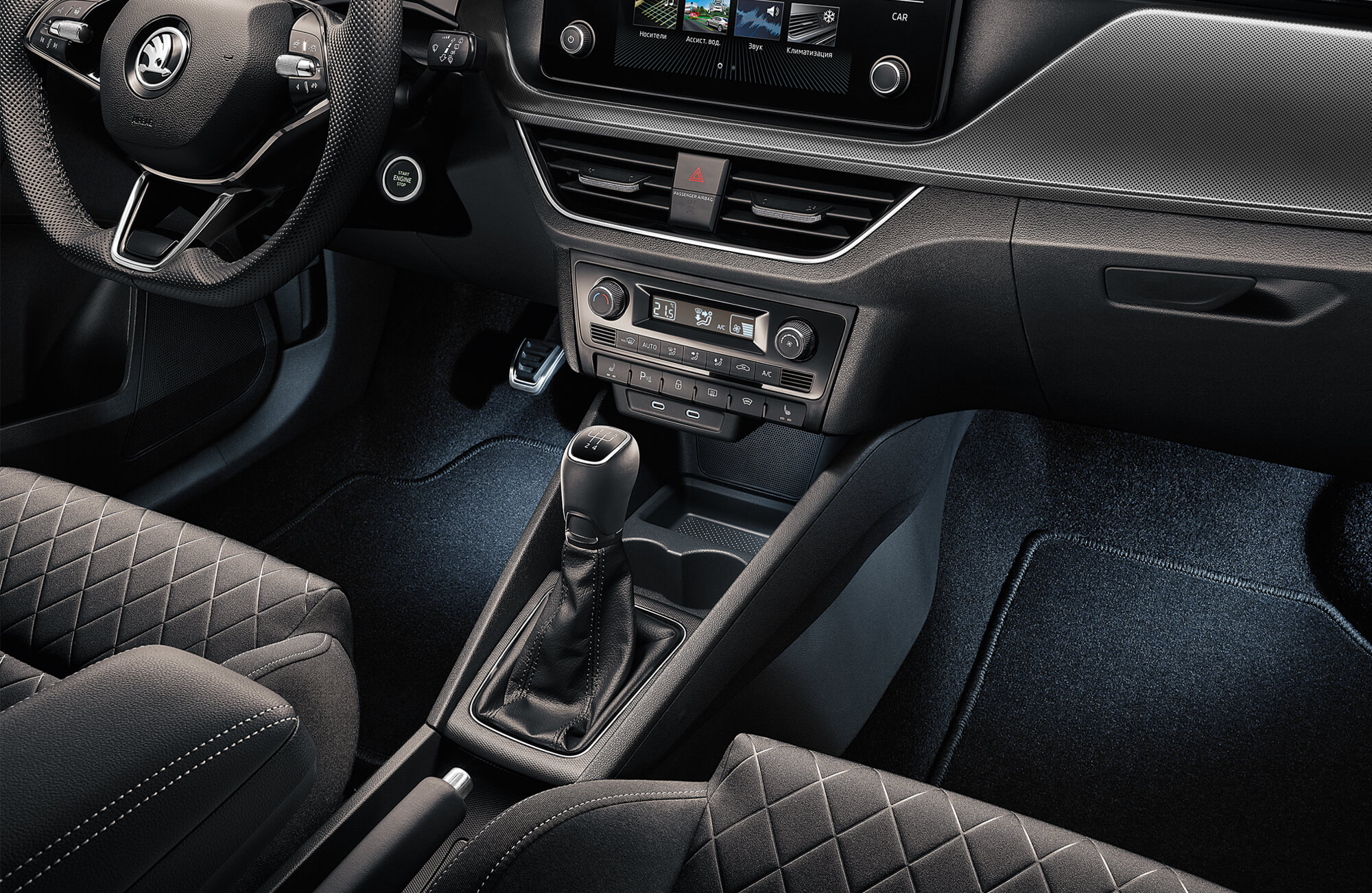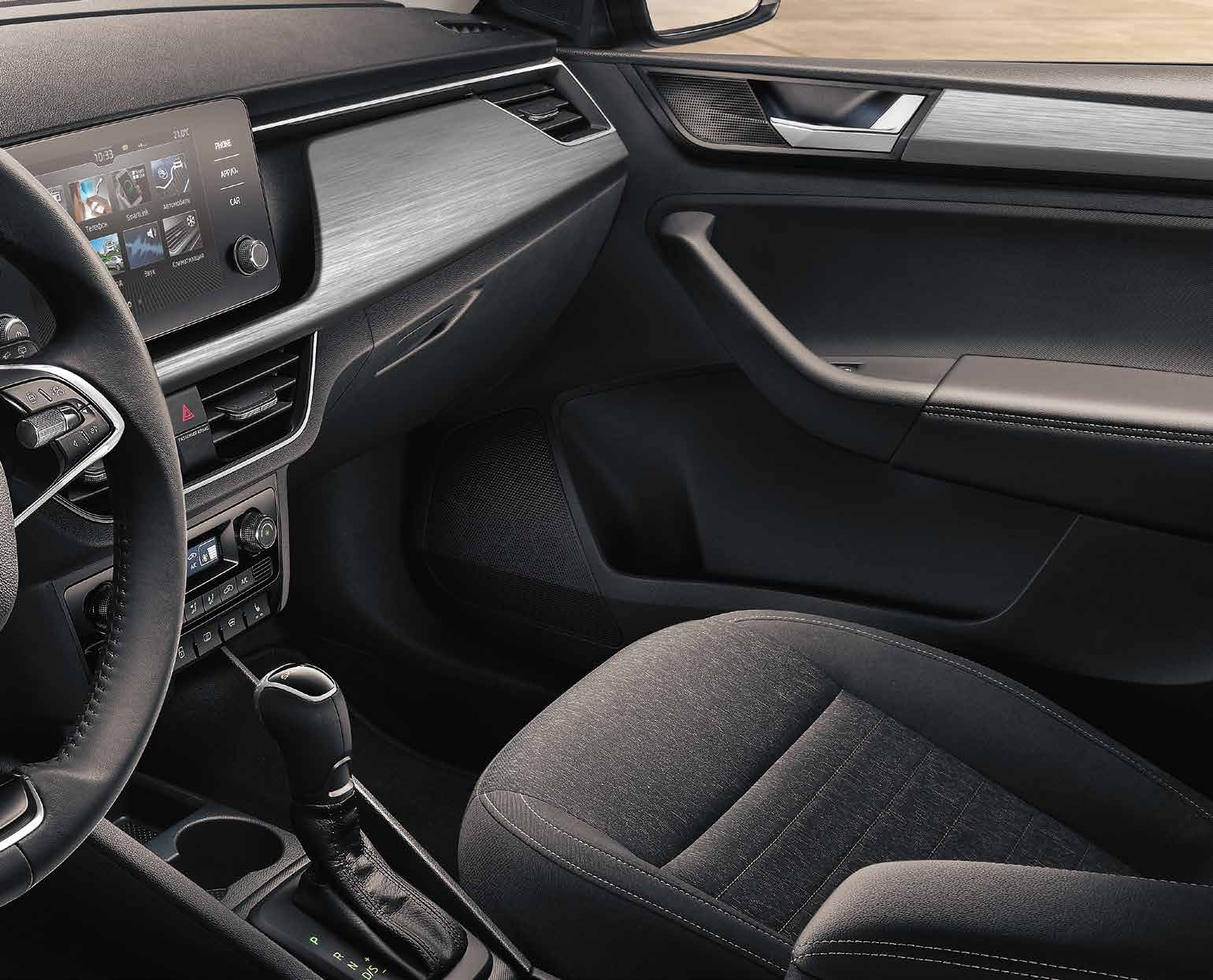 Подстаканник в центральной консоли Вещевые отделения в задних дверях Заднее сиденье неделимое, спинка делимая складная Хромированные детали интерьера (хром-пакет) Кожаный рычаг стояночного тормоза, рычаг КПП со вставкой из кожи Манжета рычага КПП из искусственной кожи Тканевые коврики спереди и сзади